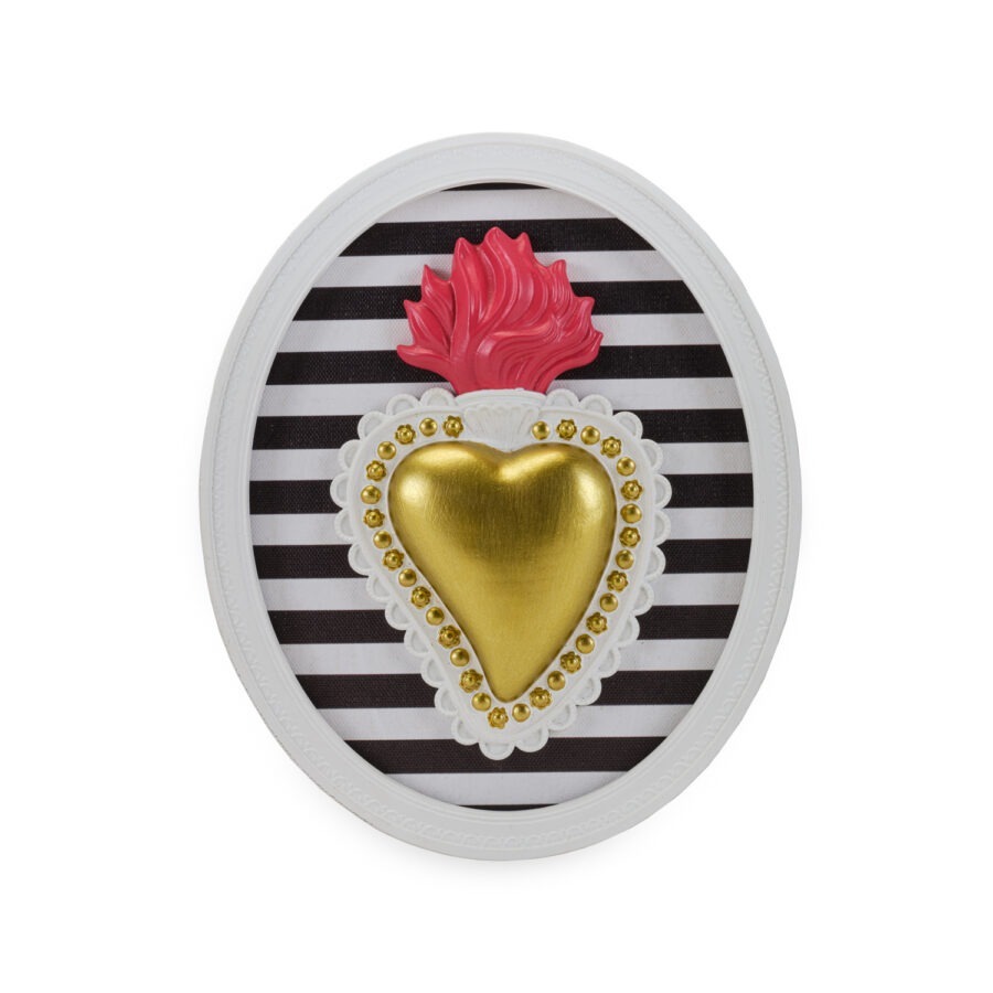 Meravigliosa cornice ovale con sfondo a righe bianco e nero, impreziosita da un maestoso cuore sacro nella colorazione oro rifinato da dettagli bianchi e rosso corallo.