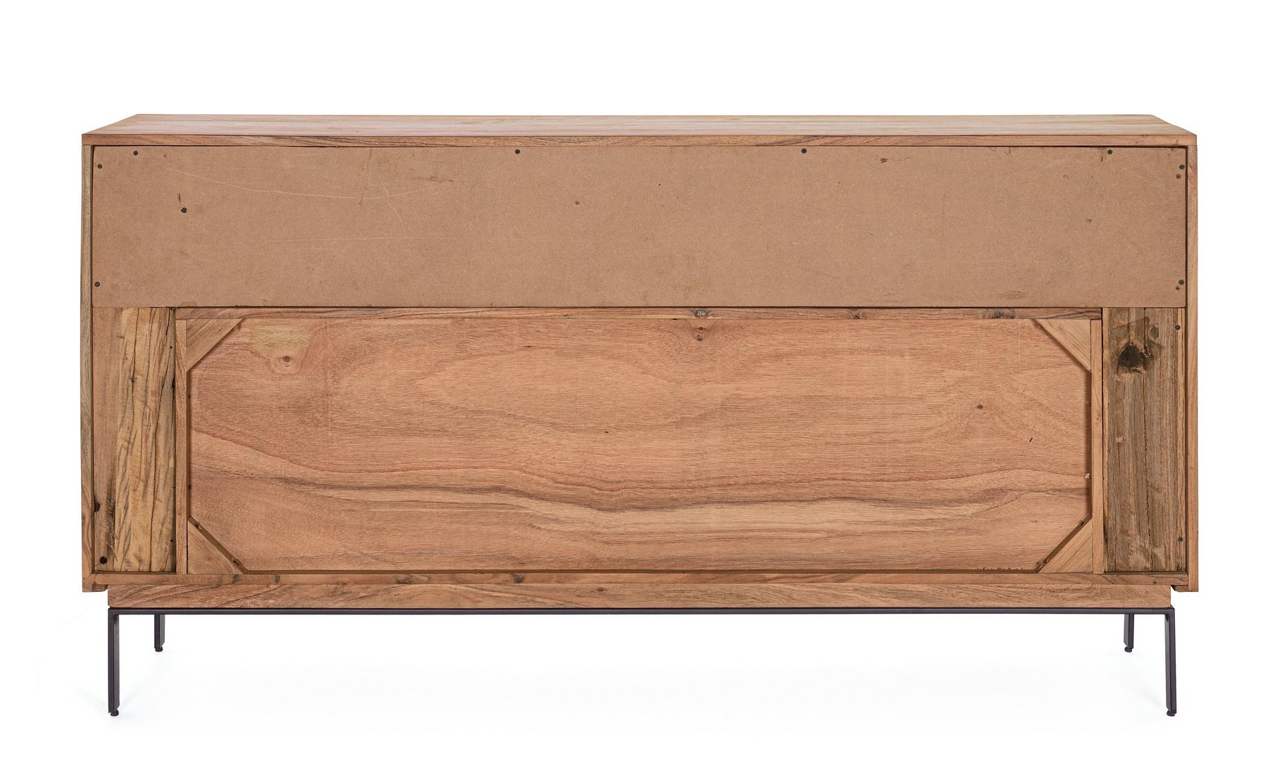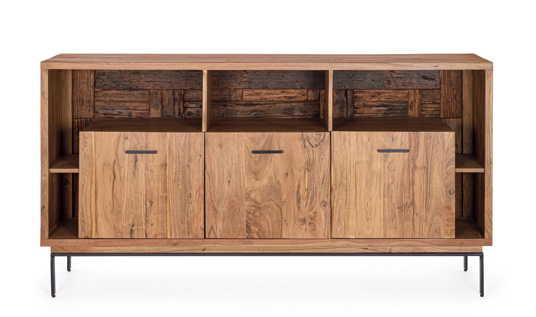 Struttura in legno di acacia, schienali in compensato, interno a vista in legno riciclato. Finitura acrilica protettiva. Ante con cerniera, chiusura ammortizzata. Maniglie e gambe in acciaio. Vano porta comprensivo di mensola. Misure: 175a – 40b – 94h