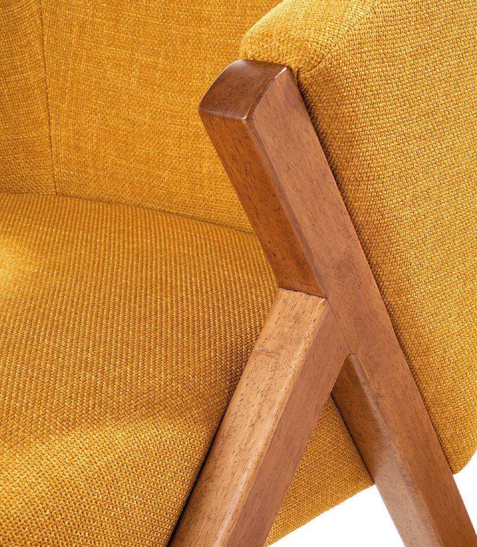 La struttura in legno massello a vista valorizza le linee architettoniche del modello, creando un piacevole contrasto materico tra la naturalezza del legno e la morbidezza della seduta imbottita. Le gambe inclinate e i braccioli integrati conferiscono stabilità, solidità e un’estetica ricercata di ispirazione nordica e mid-century.