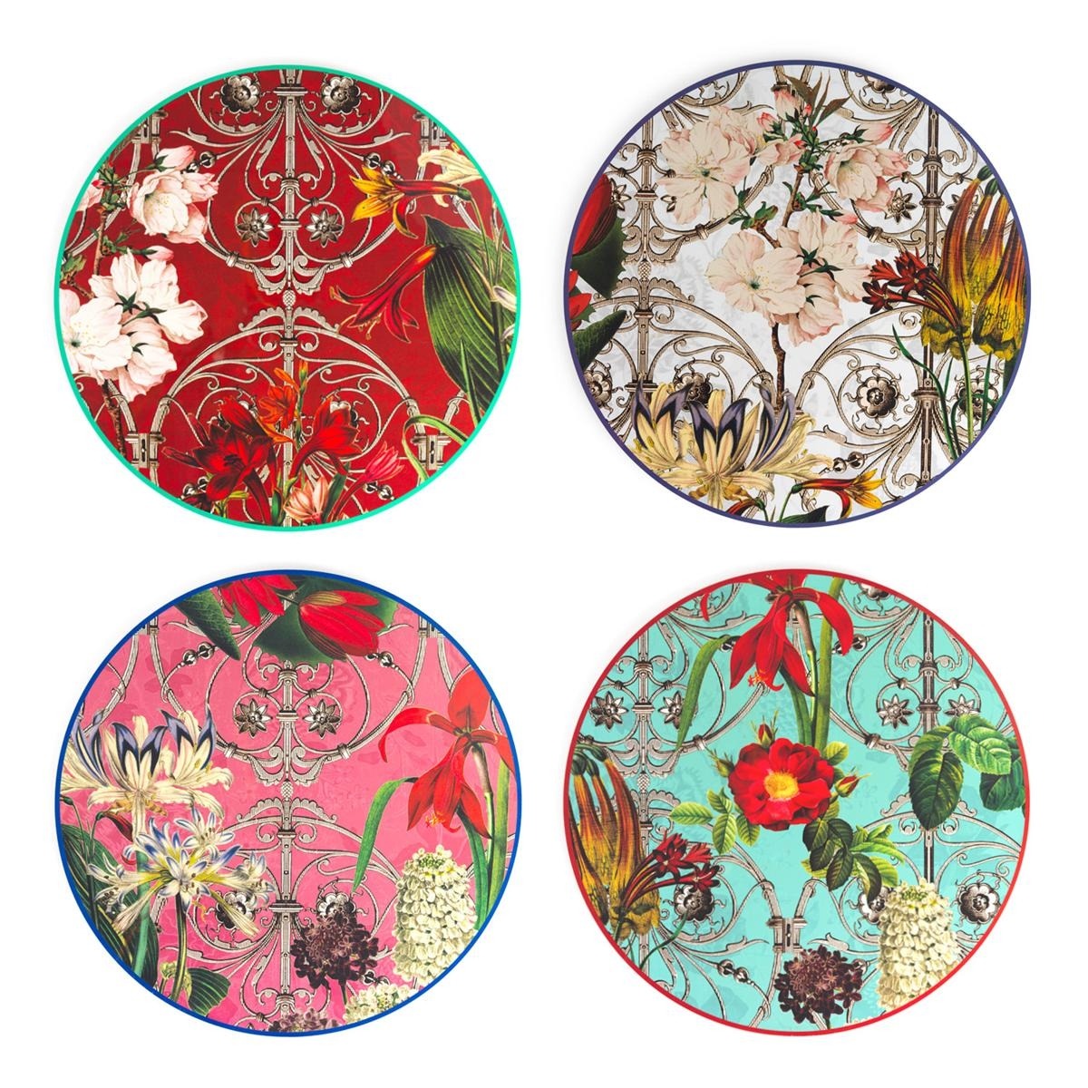 Set di sottopiatti rotondi con decorazioni floreali e fondo a righe colorate.