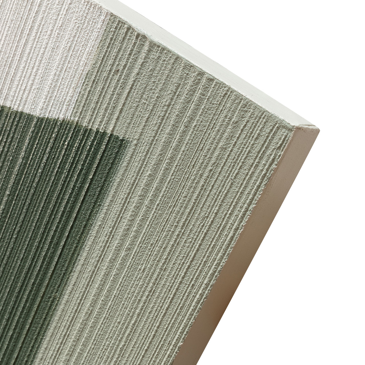 L’opera è un’affascinante esplorazione di volumi e prospettive urbane trasposte su tela. Questo quadro di design realizzato a mano si distingue per una struttura rigorosa dove linee verticali e diagonali si intrecciano, creando l’illusione di facciate architettoniche che si intersecano in un gioco di luci e ombre. La palette è estremamente sofisticata: tonalità di grigio cemento, verde bosco desaturato e accenti di ocra e terracotta si fondono in una texture “a canneté” finemente solcata, che dona al dipinto una vibrante tridimensionalità. Ogni sezione è lavorata artigianalmente per esaltare il contrasto tra le campiture di colore, rendendo la superficie dinamica e cangiante al variare dell’illuminazione ambientale.