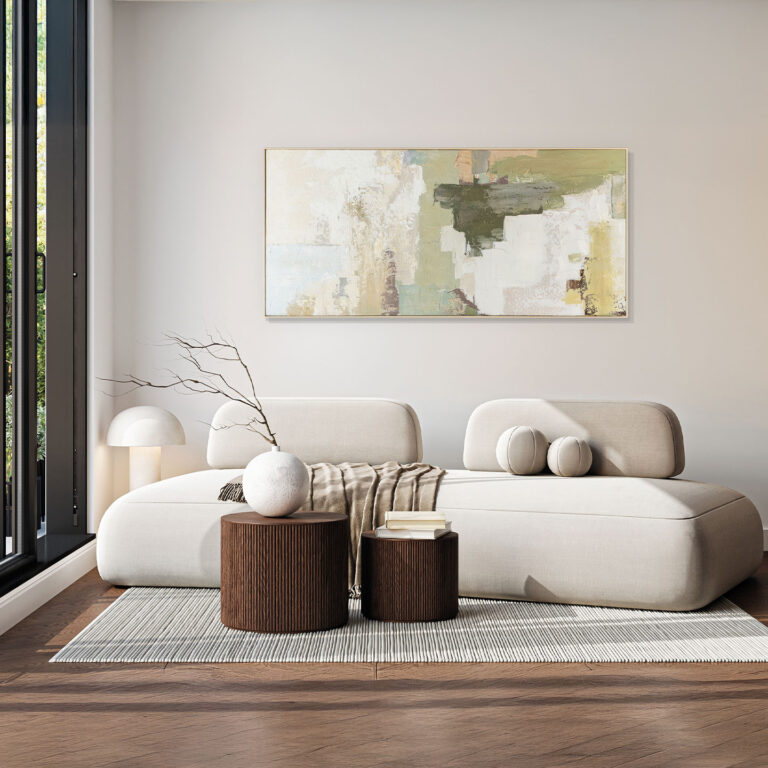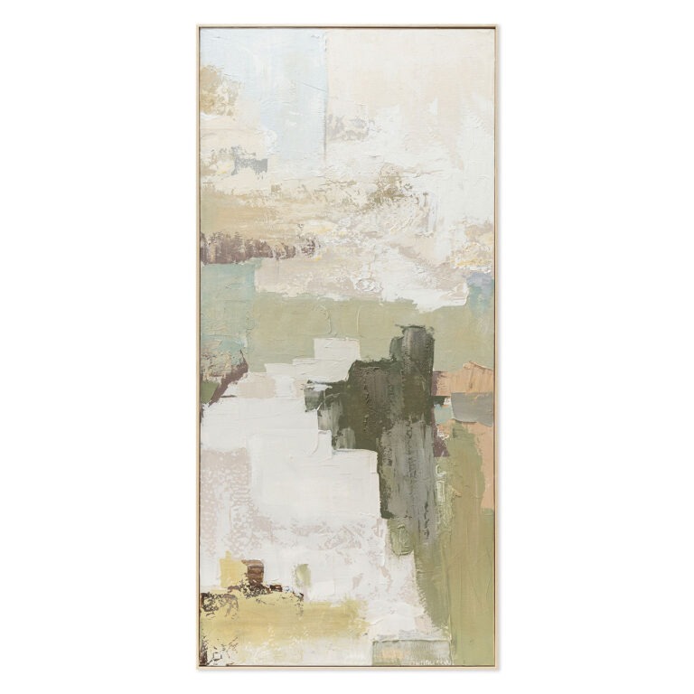 L’opera è un omaggio alla terra e alla rigenerazione naturale. Questo quadro moderno si distingue per una palette vibrante ma equilibrata, dove il verde salvia e il fango incontrano pennellate decise di grigio antracite e caldi toni sabbia. La stesura materica crea un rilievo visivo che cattura lo sguardo, rendendo ogni pezzo un’opera unica e irripetibile.