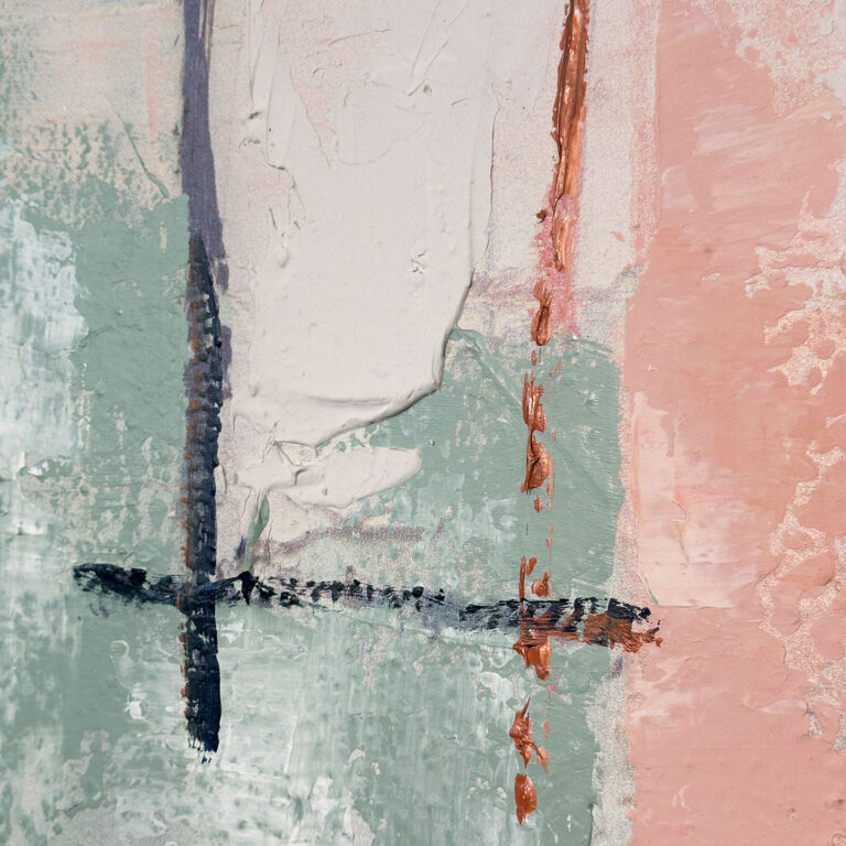 L’opera è un viaggio emozionale tra colore e materia. Questo quadro si distingue per una composizione stratificata e complessa, dove pennellate decise di blu cobalto e oltremare si fondono con sfumature eteree di rosa cipria, salvia e ocra.