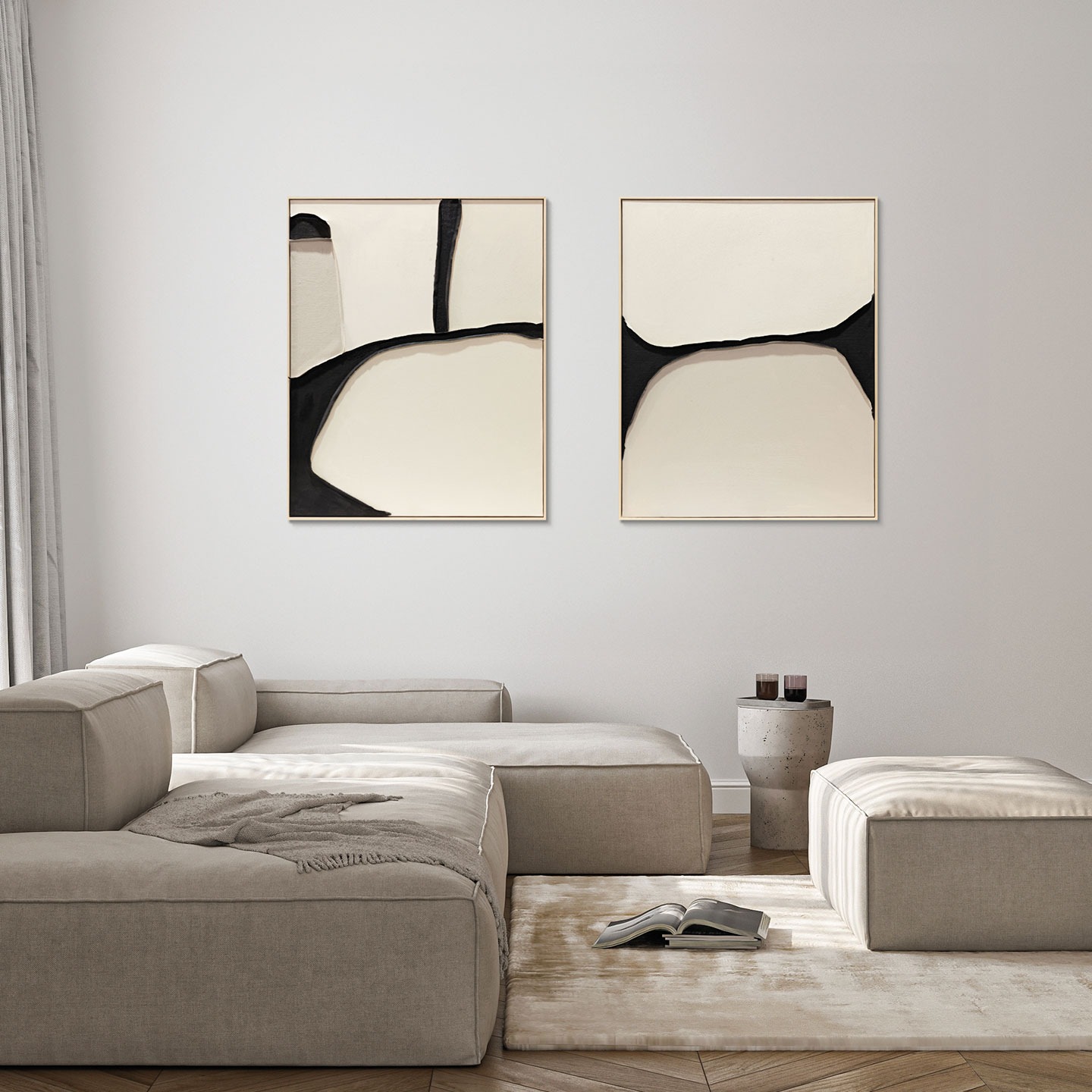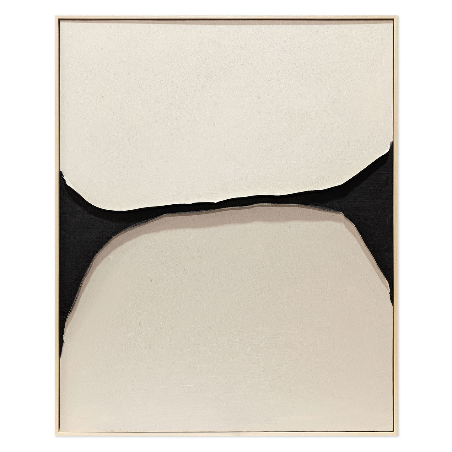 Rappresenta l’essenza del dinamismo racchiuso nella semplicità. Questo quadro rompe gli schemi della decorazione tradizionale attraverso un potente contrasto cromatico tra il nero assoluto e il bianco ottico. La composizione è dominata da una linea fluida che attraversa la tela, creando una tensione visiva tra due masse organiche che sembrano attrarsi e respingersi contemporaneamente. La tecnica artigianale emerge nel dettaglio dei bordi: non semplici tratti, ma profili materici che conferiscono all’opera una presenza scultorea sulla parete.