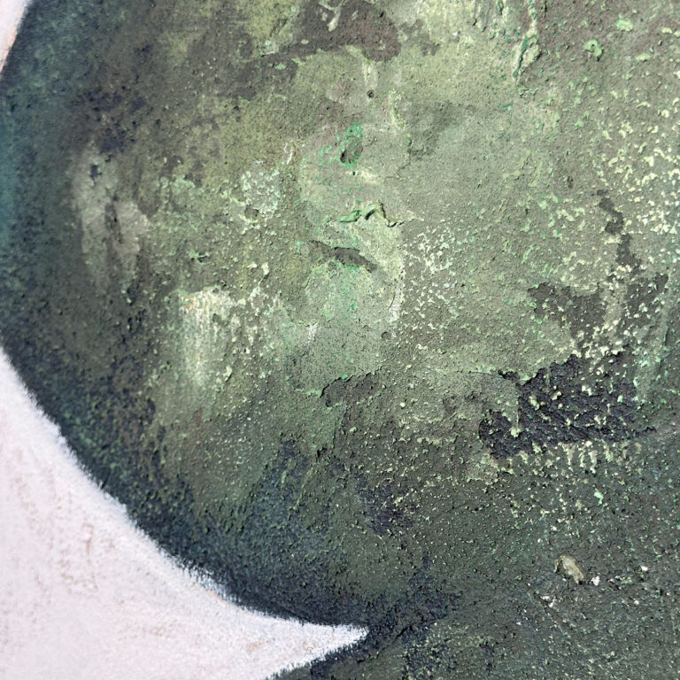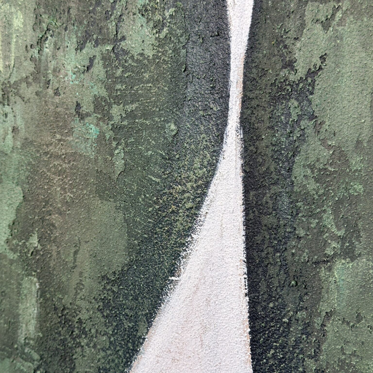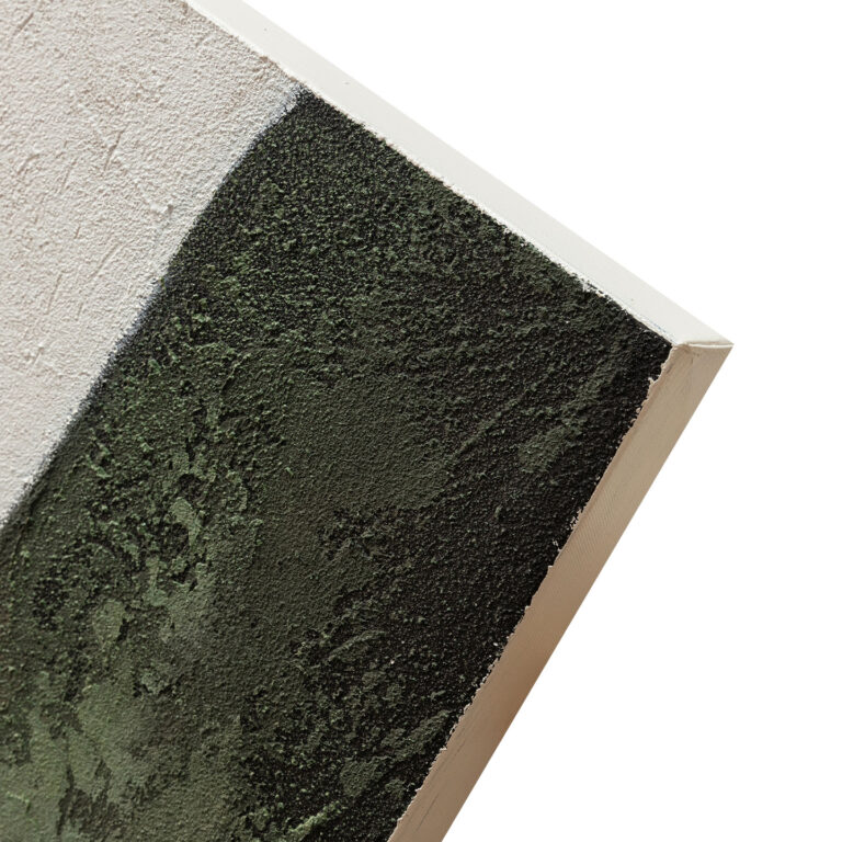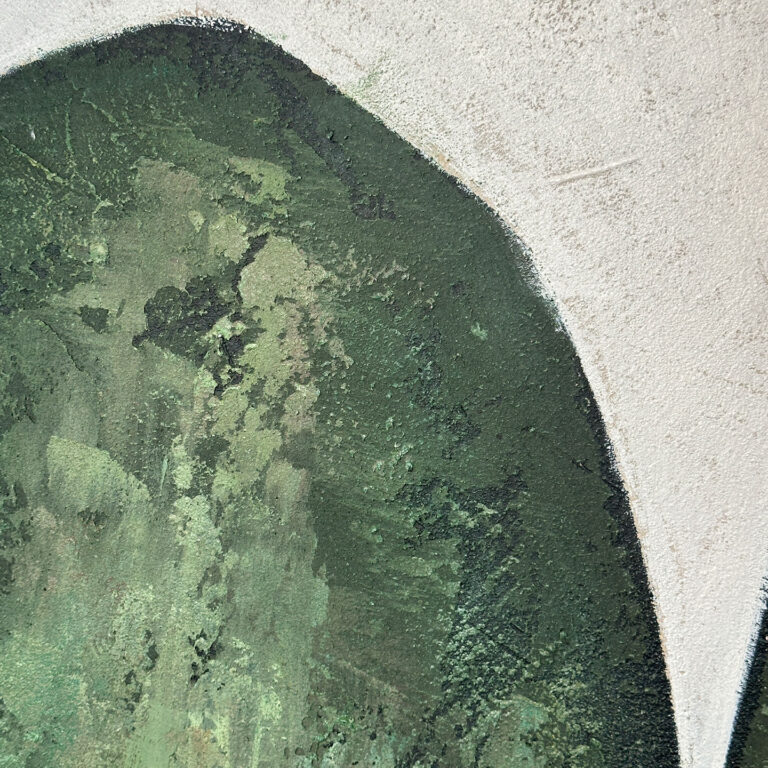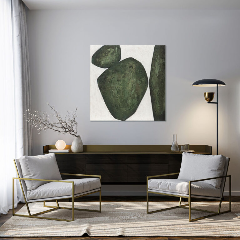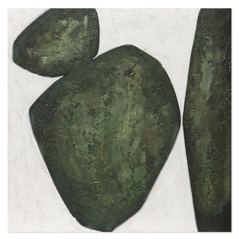 L’opera è un’esplorazione artistica che trasforma la solidità della pietra in pura poesia visiva. Questo quadro cattura l’essenza degli elementi naturali attraverso la rappresentazione di forme morbide e smussate che evocano sassi levigati dal tempo. La palette cromatica è dominata da un profondo verde bosco desaturato, steso con una tecnica materica che lascia emergere venature e chiaroscuri, in perfetto contrasto con lo sfondo color panna dalla texture granulosa e vibrante. La stesura artigianale del colore dona alle sagome una tridimensionalità quasi scultorea, rendendo il dipinto un punto focale magnetico per qualsiasi parete.