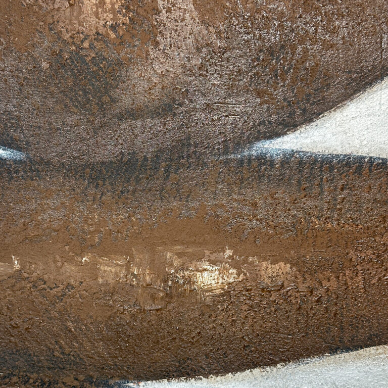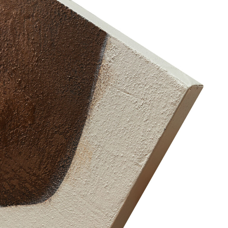 Questo quadro di design realizzato a mano raffigura una composizione verticale di forme organiche che richiamano l’antica arte del stone balancing: tre volumi scultorei si sovrappongono in un bilanciamento precario ma perfetto. La palette è dominata da un marrone brunito e materico, ricco di sfumature ferruginee che evocano la pietra naturale, staccandosi con decisione da uno sfondo bianco calce dalla texture granulosa.