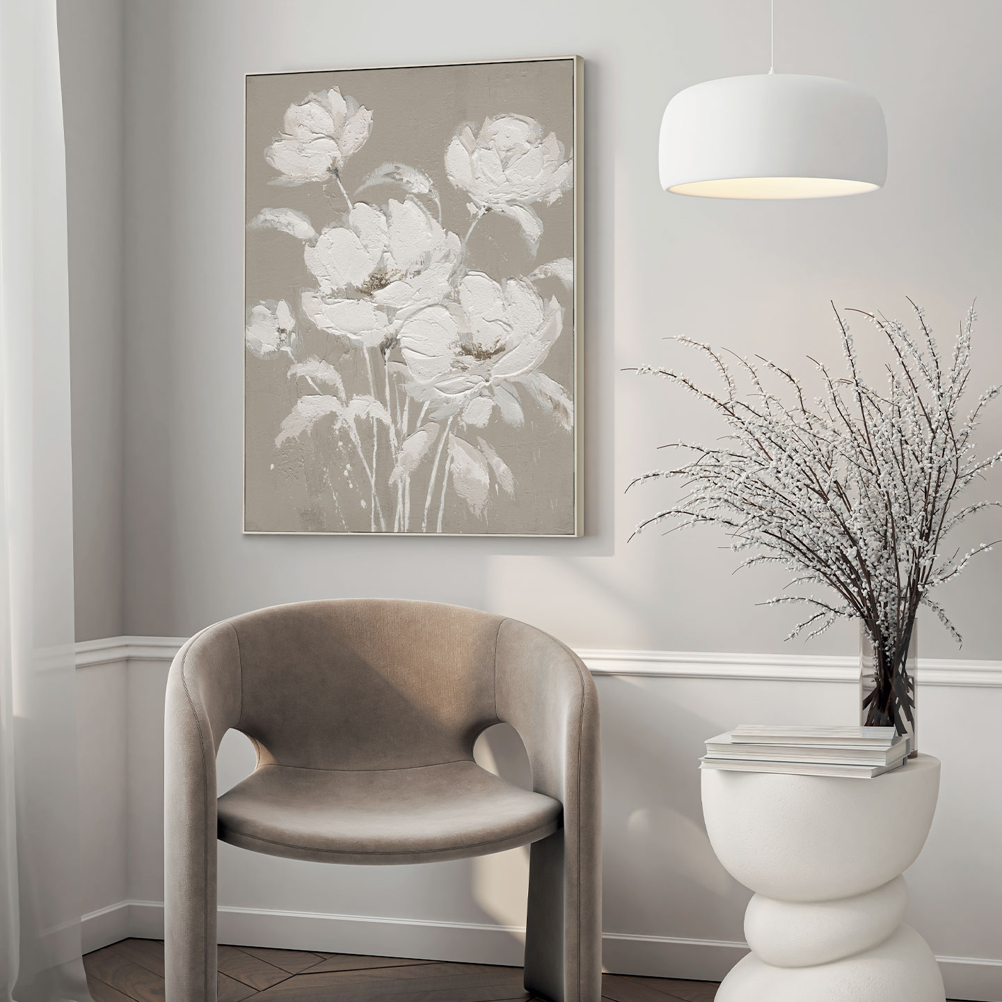 Una delicata composizione floreale emerge dalla materica pittura bianca magistralmente applicata su un fondo neutro. Ibisco è un’opera di spiccata raffinatezza in grado di elevare ogni ambiente con sobria eleganza.