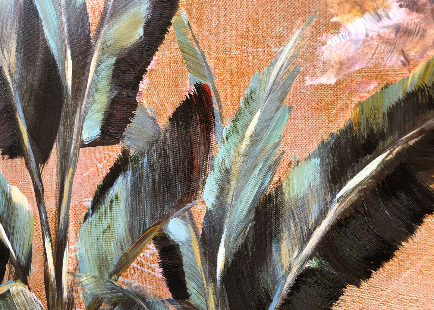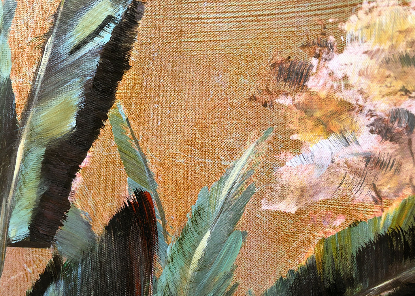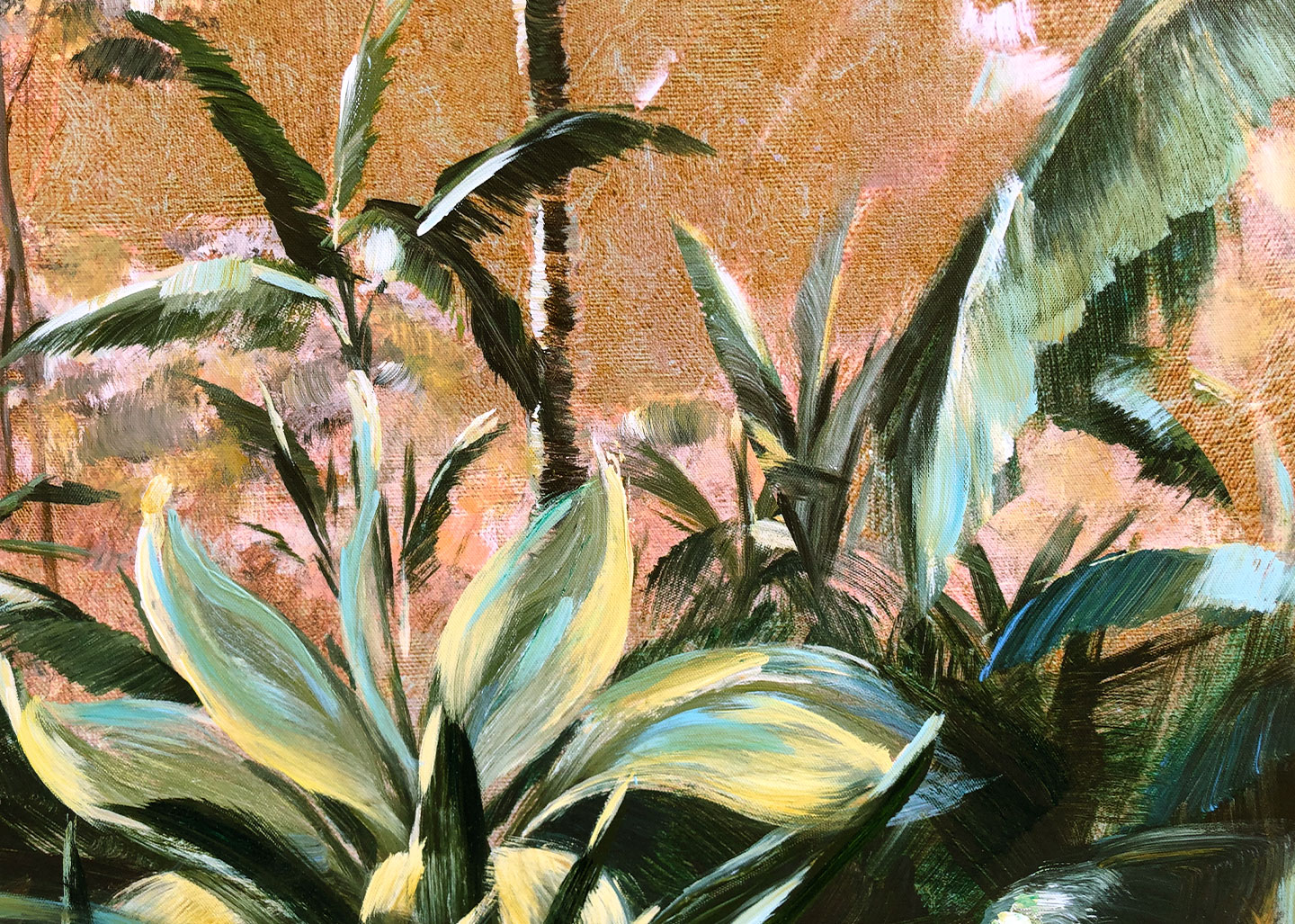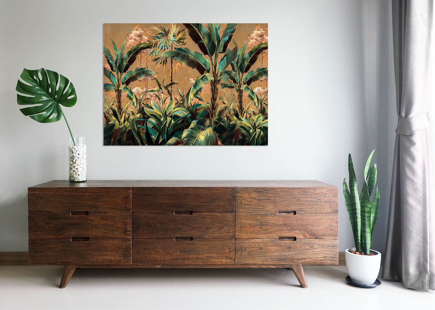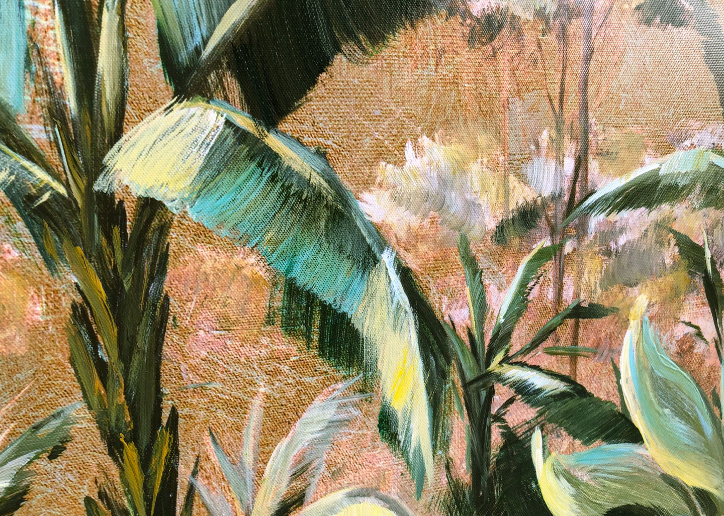 Wild è un quadro che rappresenta piante tropicali, dipinto a mano su tela di cotone.