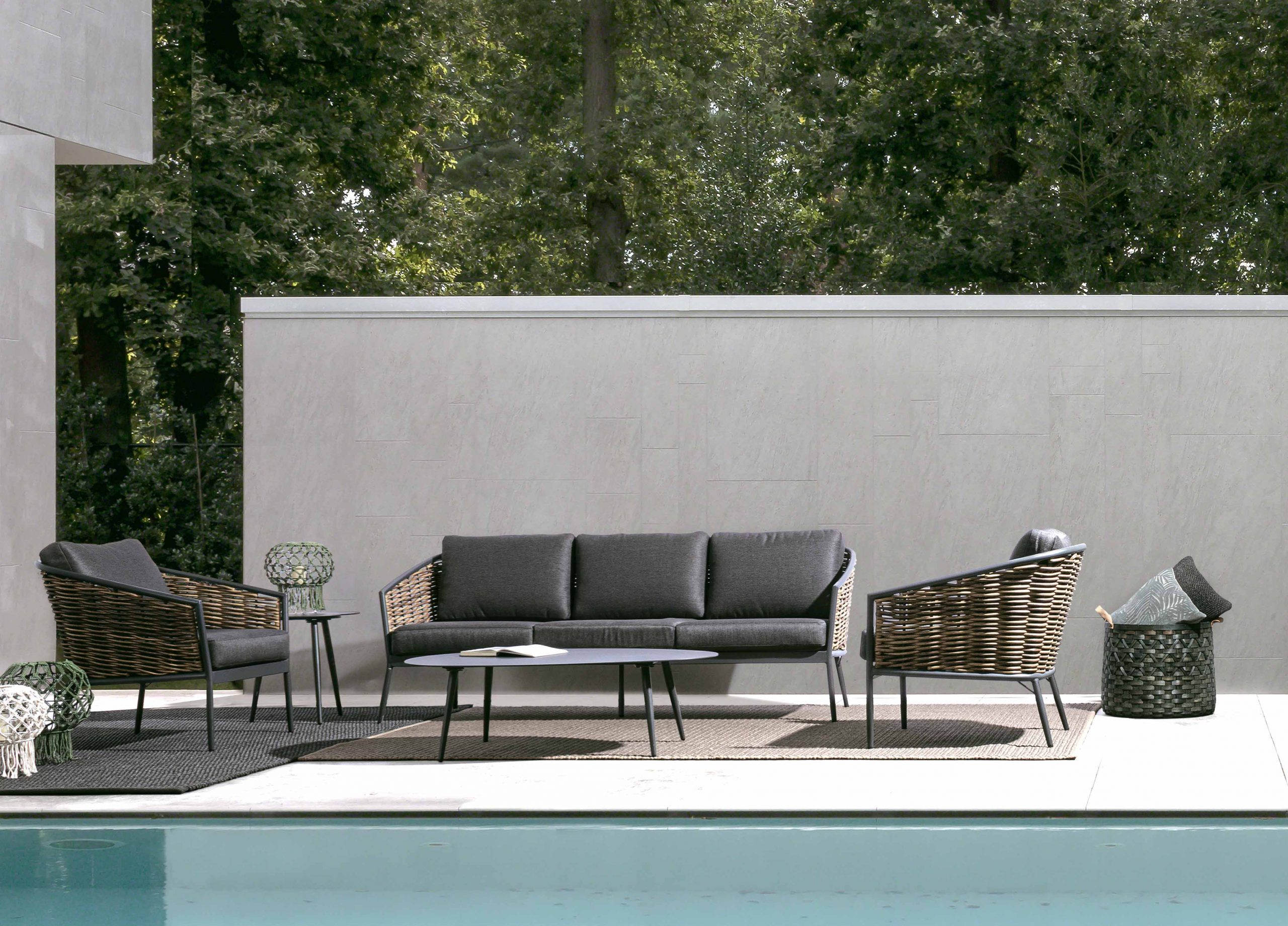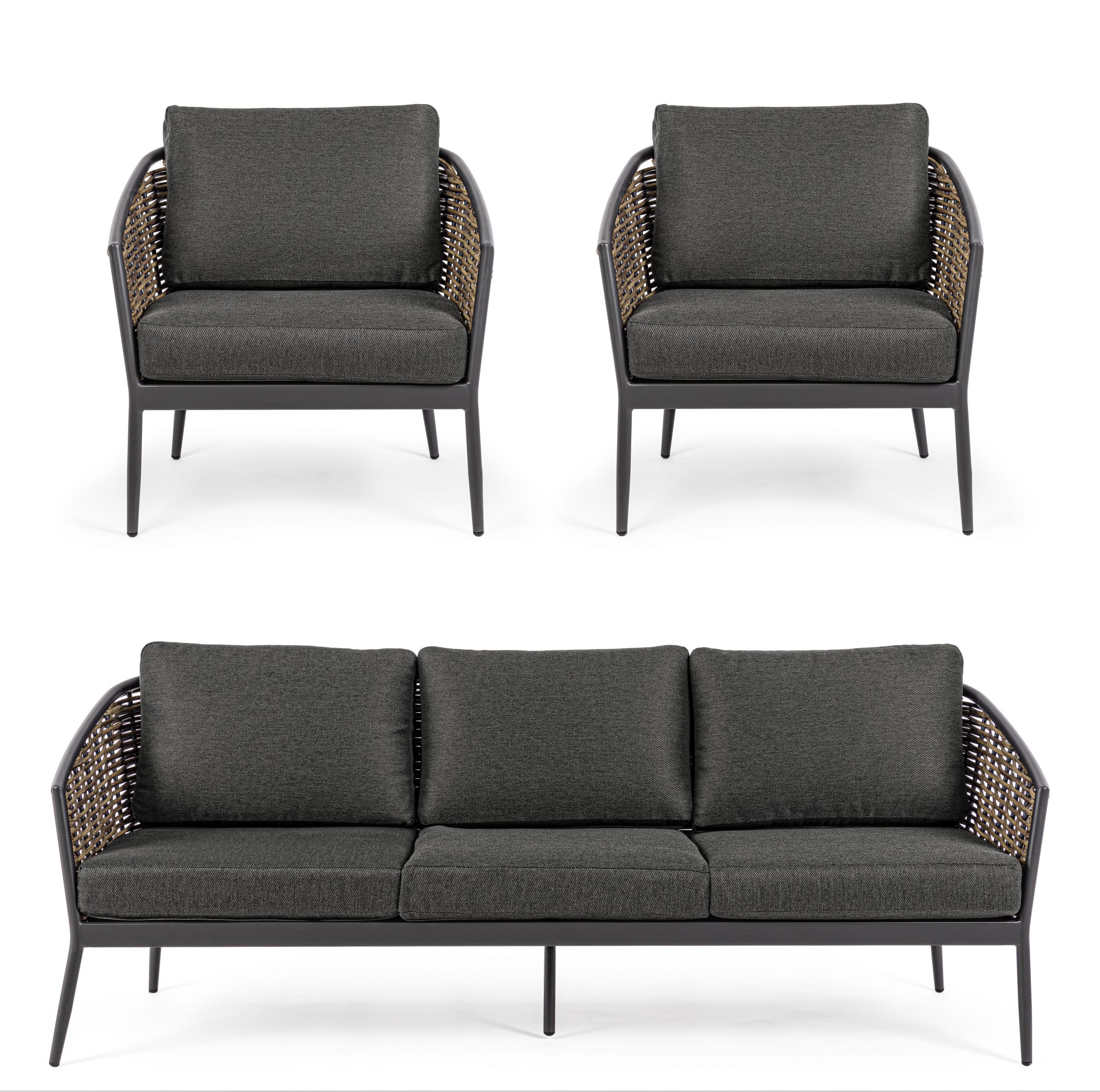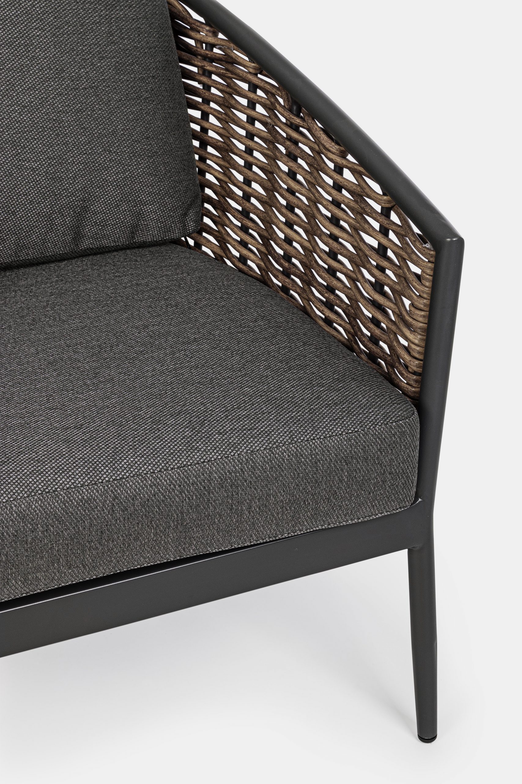 Struttura in alluminio verniciata a polvere (poliestere). seduta rivestita in fibra sintetica (tonda 9mm). cuscini seduta e schienale sfoderabili con tessuto olefin (100% polipropilene).