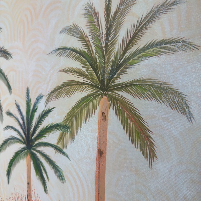 L’opera raffigura un suggestivo palmeto che svetta su dune sinuose, reso con uno stile grafico contemporaneo che gioca su motivi geometrici e texture materiche.