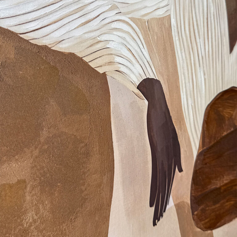 Il contrasto tra le tonalità calde della terra e il fondo neutro e luminoso crea un’atmosfera chic e senza tempo.