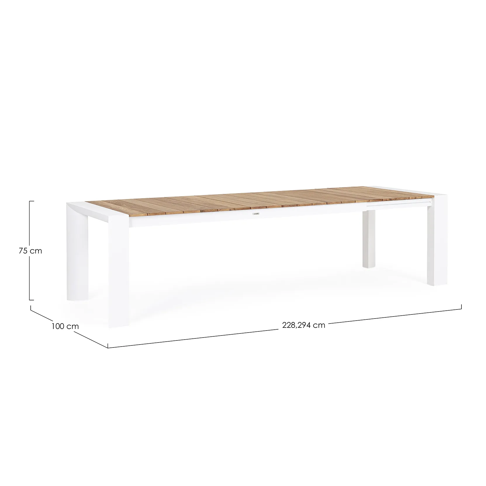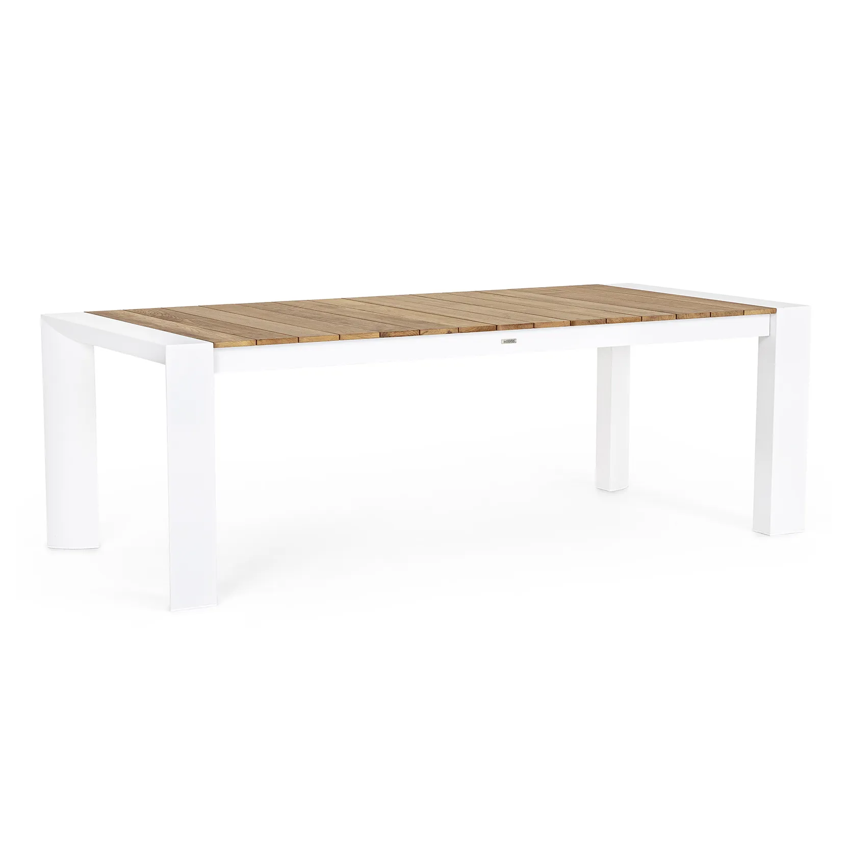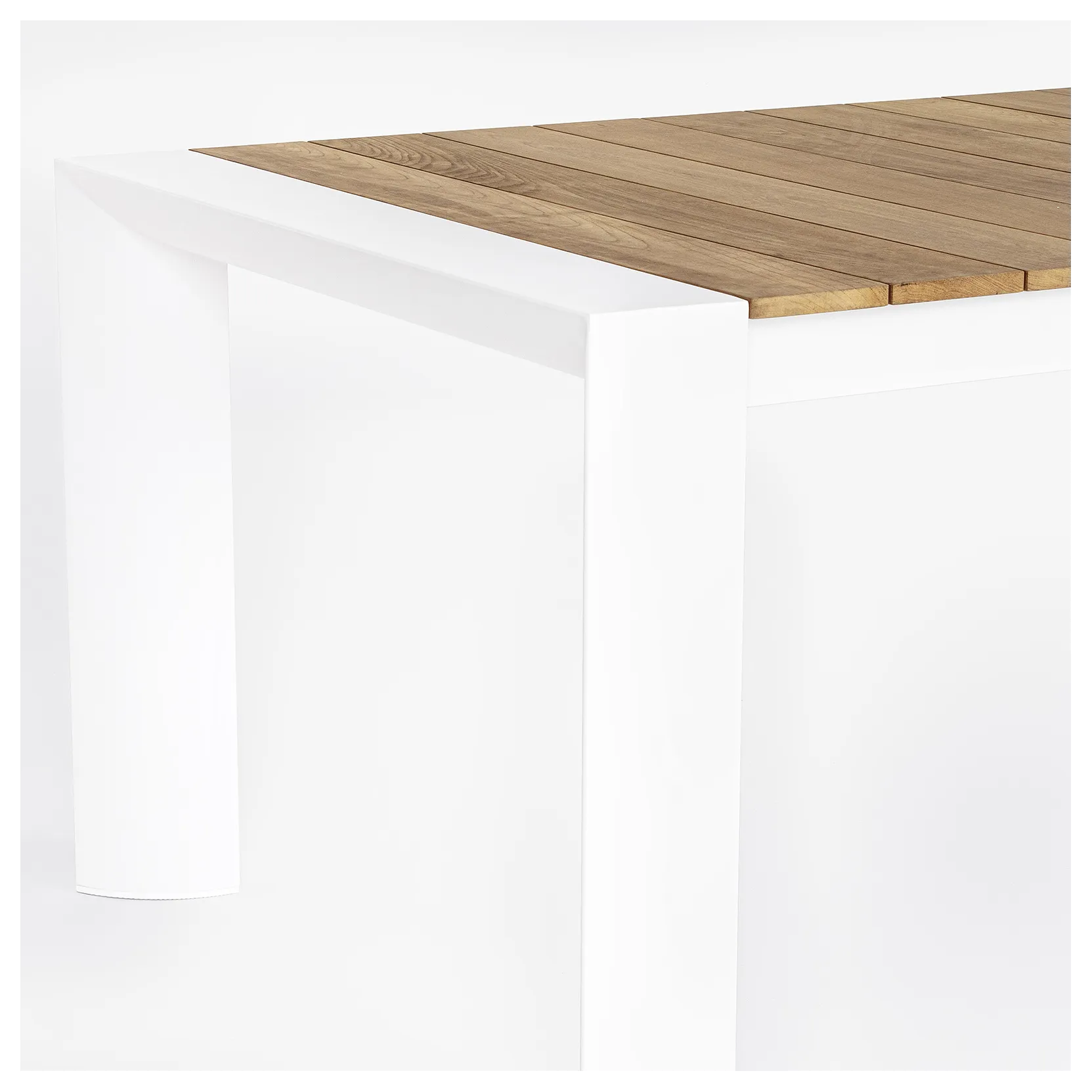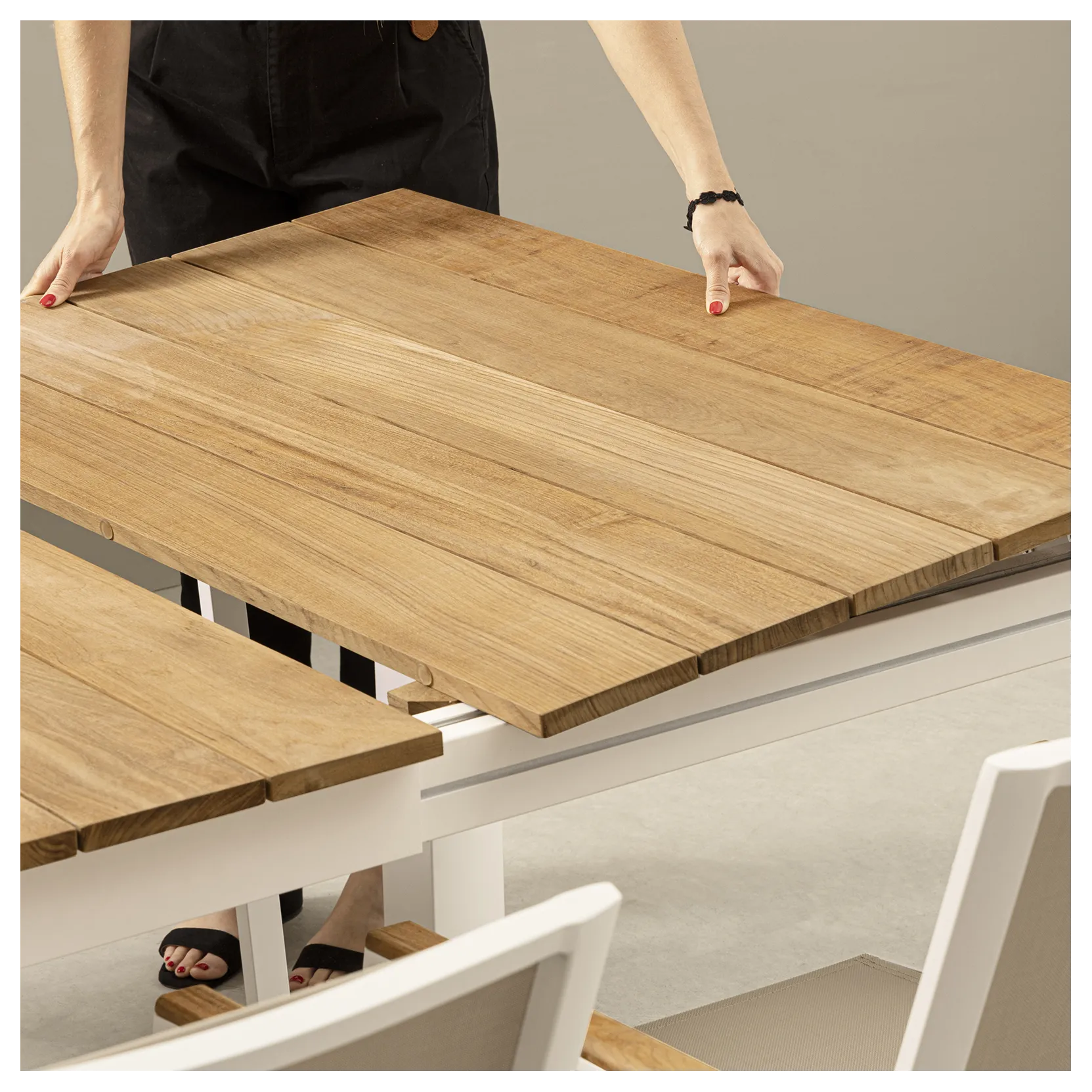 Il piano in teak, caratterizzato da eleganti listelli, dona un aspetto raffinato e accogliente, mentre la struttura in alluminio garantisce leggerezza, stabilità e resistenza agli agenti atmosferici, rendendo il tavolo perfetto per un utilizzo prolungato all’esterno.