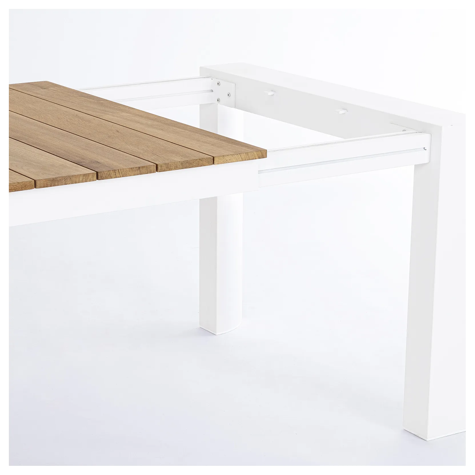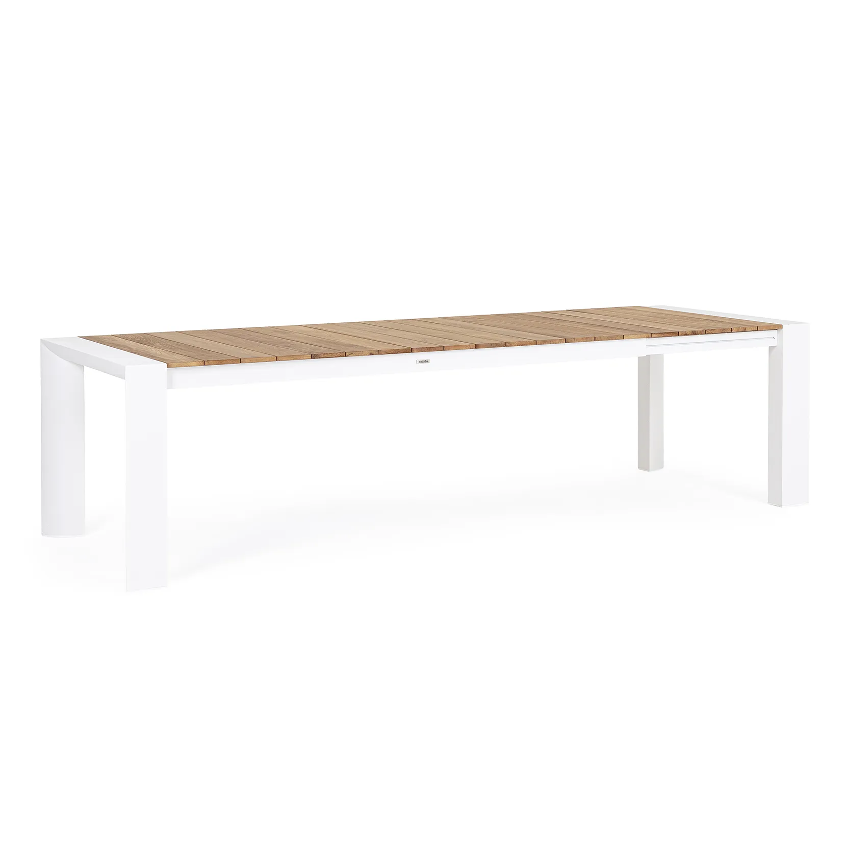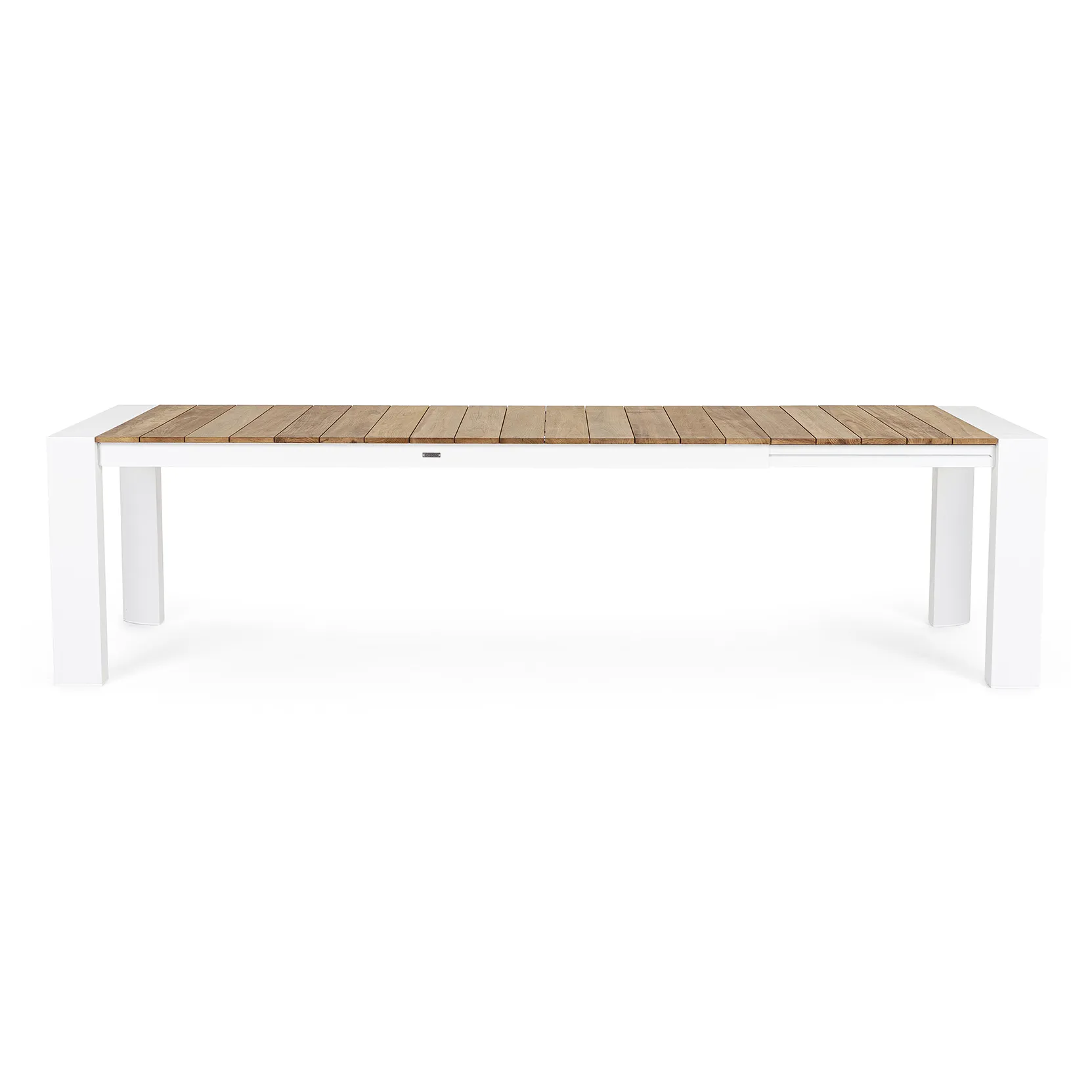 Tavolo da esterno allungabile con struttura in alluminio e piano in teak.