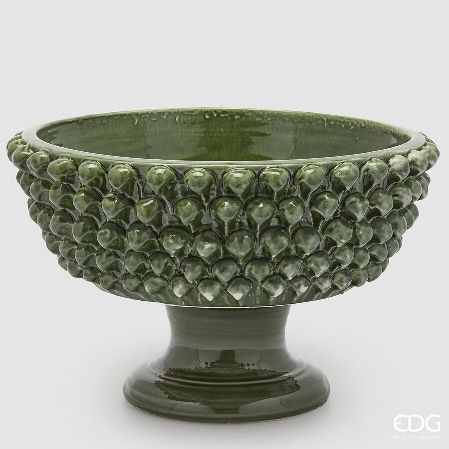 Coppa decorativa su piede in ceramica smaltata color Verde intenso con raffinata texture a rilievo. Perfetta come centrotavola o elemento d’arredo luminoso.